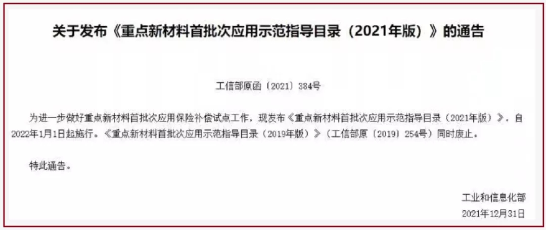據工信部網(wǎng)站消息,為進(jìn)一步做好重點(diǎn)新材料首批次應用保險補償試點(diǎn)工作,工信部發(fā)布《重點(diǎn)新材料首批次應用示范指導目錄(2021年版)》(工信部原〔2021〕384號),自2022年1月1日起施行?!吨攸c(diǎn)新材料首批次應用示范指導目錄(2019年版)》(工信部原〔2019〕254號)同時(shí)廢止。