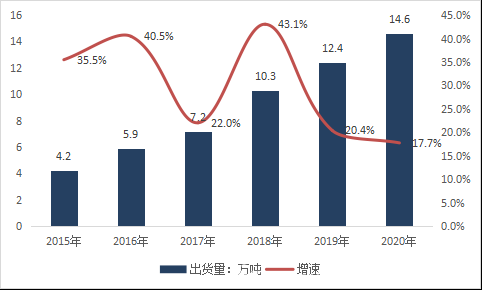 根據《中國銅箔行業(yè)發(fā)展白皮書(shū)(2021年)》數據顯示,2020年,中國鋰電銅箔出貨量達到14.6萬(wàn)噸,同比增長(cháng)17.7%。2015-2020年鋰電銅箔出貨量年均復合增速高達28.3%。