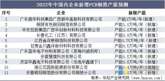 2022年中國內企業(yè)新增PCB銅箔產(chǎn)能的預測